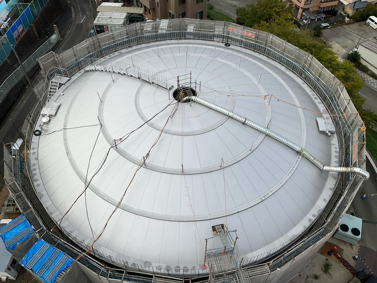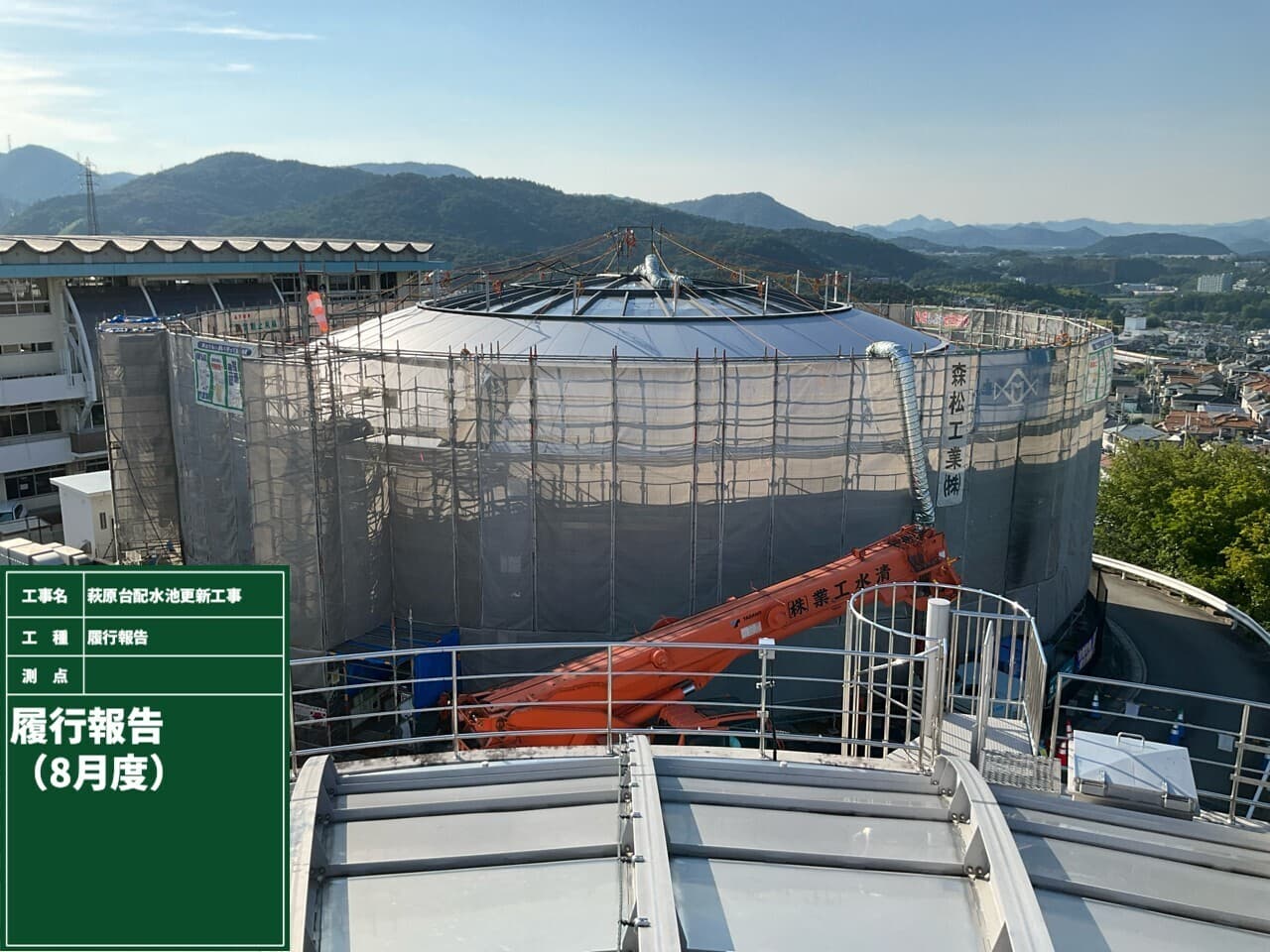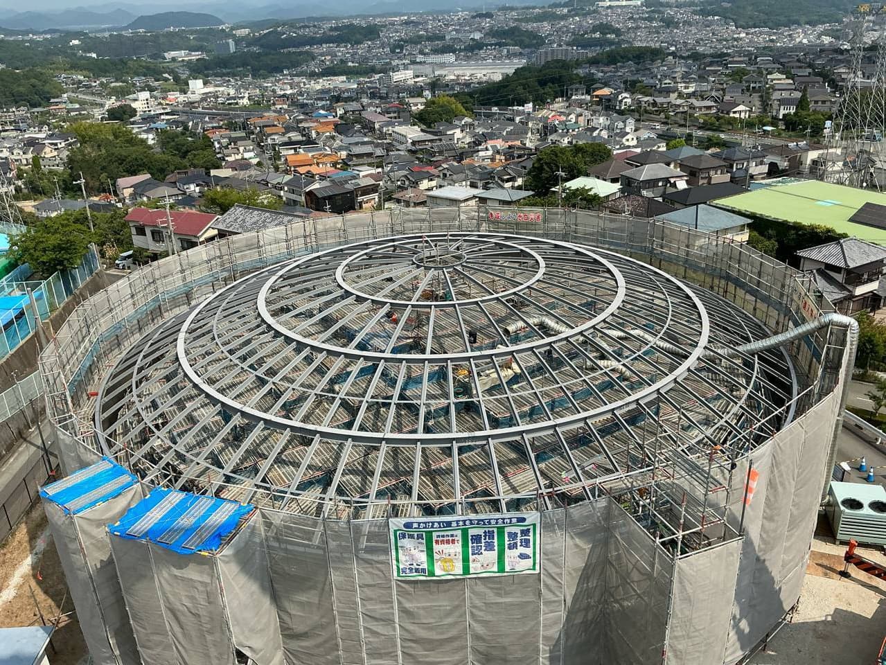 7月末で配水池天井の梁となるリングラフターの組立が完了しました。
